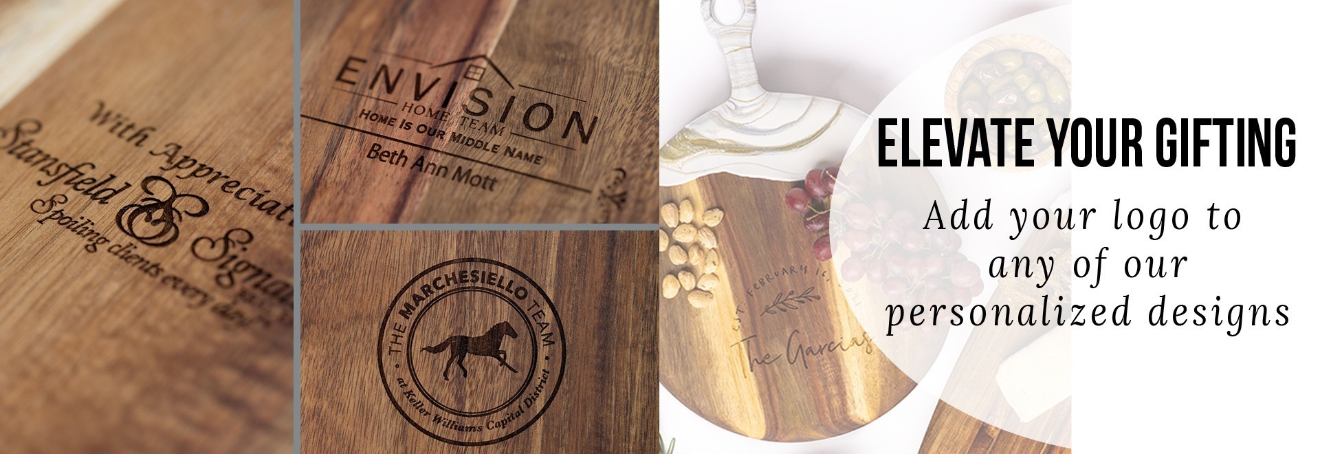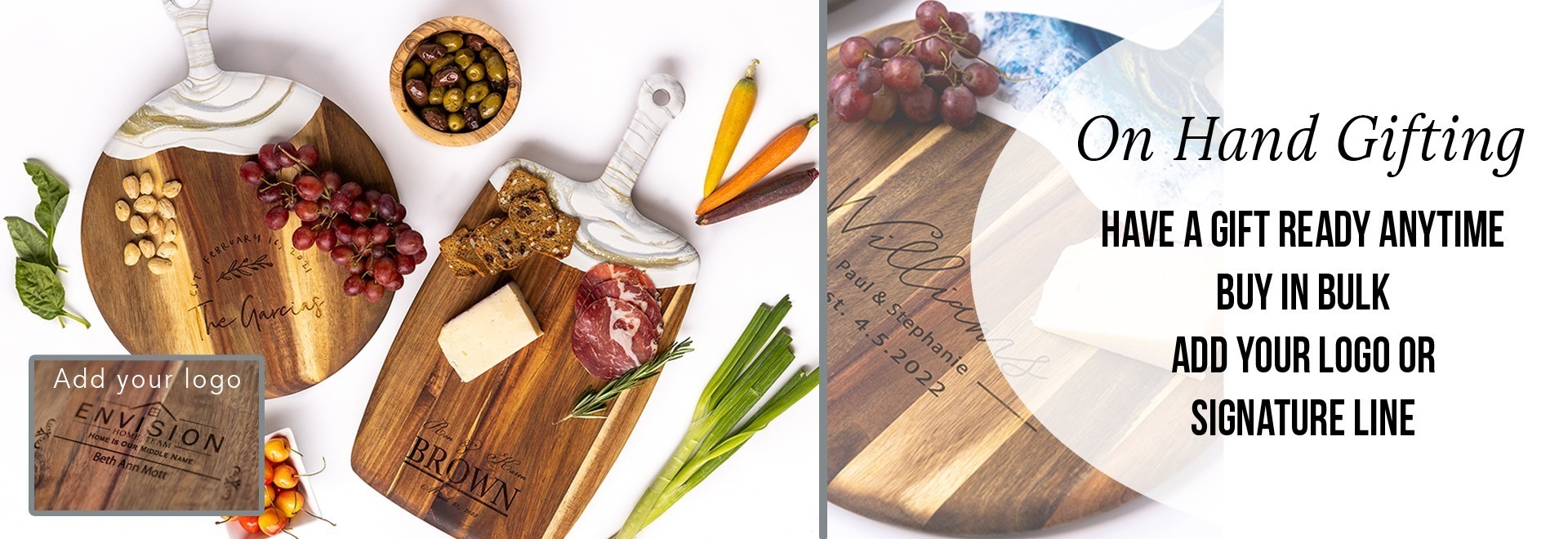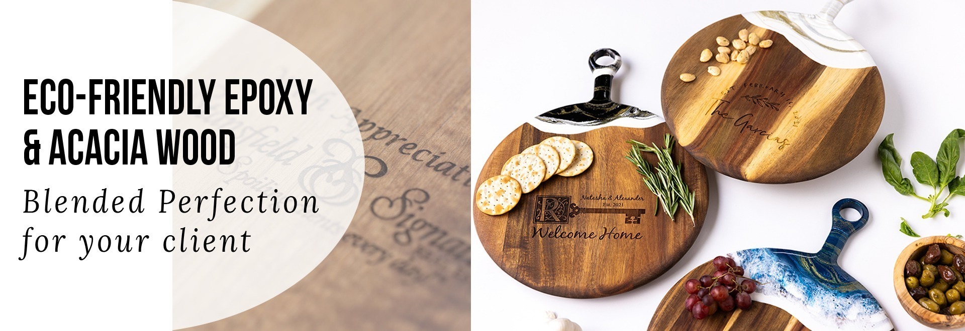 Each product is custom laser-engraved with your client’s monogram on the front of the Acacia Wood Cheese Board with Epoxy Resin and your marketing message/logo on the back.