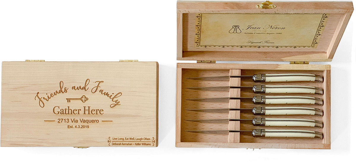The 6-piece steak knife set comes in a beautiful presentation box. The box, which is a perfect way for your clients to store their knives, is engraved with your client’s name or monogram on the front of the box lid. In addition, we include your signature line and marketing message in the bottom corner of each box. Inside the lid of the box, you will find the certificate of authenticity showing that the knives were made in the famous town of Laguiole, France.