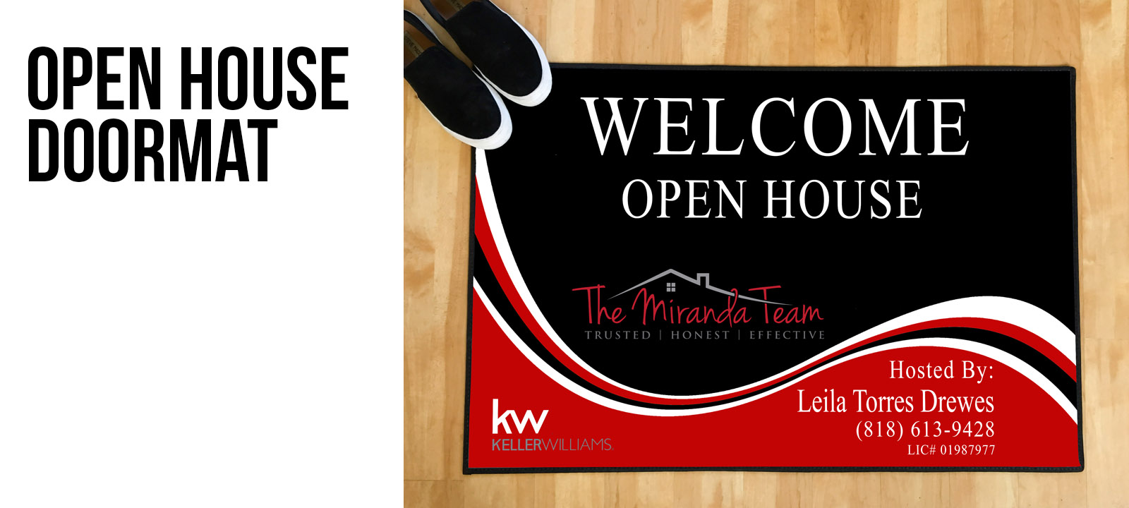 Open House doormats with your name, logo, contact info, & corporate colors are available in multiple templates allowing you to select the one that best matches your style and brand. Each mat is durable and easily cleaned with a broom or hose. We use high quality material, making the full color graphics permanent and usable indoors as well as outdoors. They can be easily rolled up and stored in your car trunk when not in use.