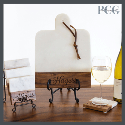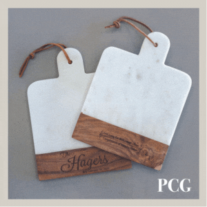 PCG Home Décor Italian Marble with Acacia Wood Cheese Boards serve two purposes: they’re both functional cheese boards and attractive home décor. Each board can be customized with your recipient’s name engraved on the front. In addition, this captivating gift ensures your name stays at the forefront of your client’s mind daily, with your subtle yet effective marketing on the back. Unlike consumable gifts, these durable and long-lasting cheese boards become a permanent fixture on your client’s countertop, serving as a constant reminder of your thoughtful gesture. Choose from nine distinct engraving styles.